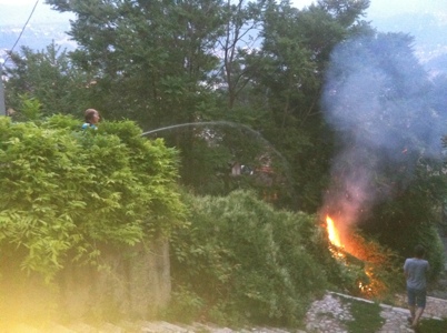 Det hade börjat brinna och gubben i huset bredvid rycker ut men slangen var dessvärre inte så lång.